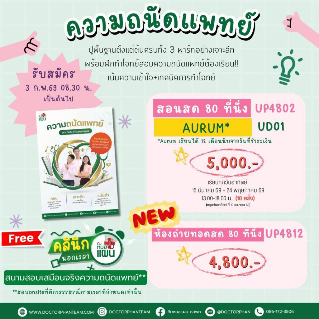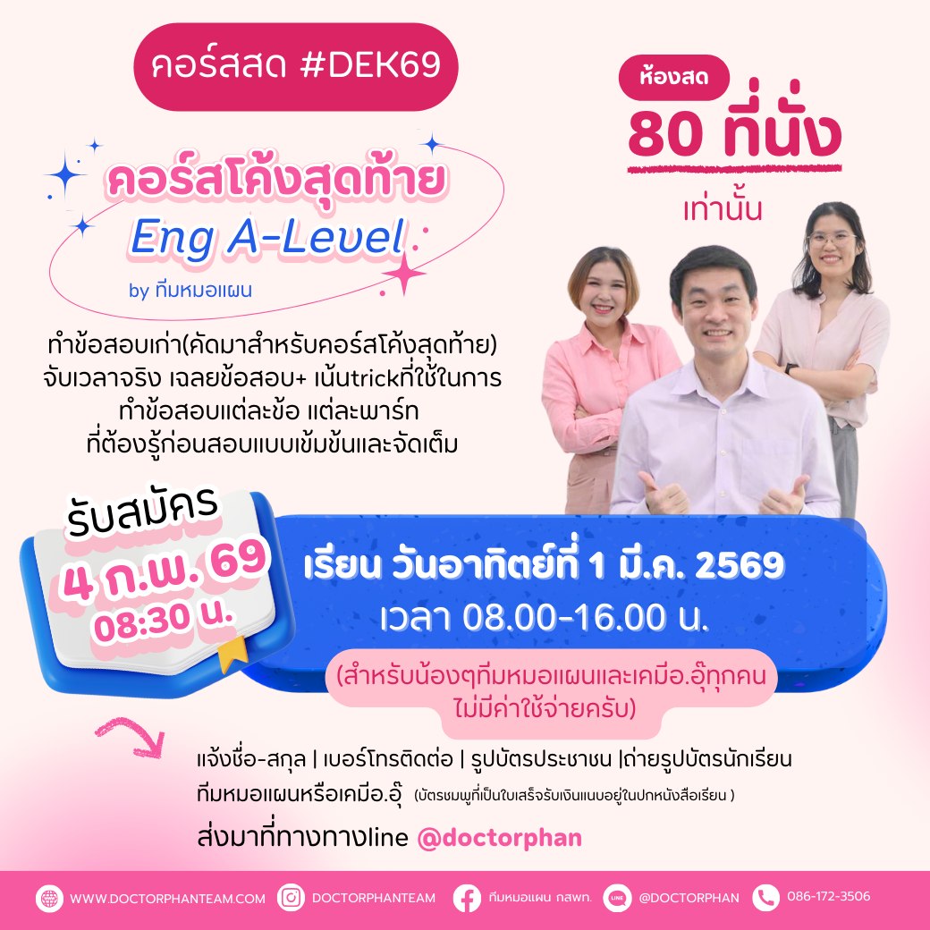 Our course Our course Read more Watch Video อยากเป็นหมอ ต้องดูคลิปนี้!! เจาะลึกข้อสอบ ปี 66 DEK'68อยากเป็นหมอ ทำตามนี้ ทำไมต้อง...ทีมหมอแผน Our course ความในใจของน้องๆ คนเก่ง มุม คุณหมอ คนเก่ง Our course ดูคอร์สของพี่หมอแผนทั้งหมด คลิก!! Read More Line Line @doctorphan Facebook Facebook ทีมหมอแผน กสพท. Ion-ios-telephone-outline Phone086-172-3506